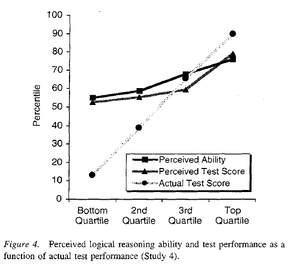 The actual data from the paper is more like this. In this chart while the novice does have an exaggerated view of his abilities not only is it lower than the experts but it needs to be understood in context. First of all the extreme novice, cannot underestimate their knowledge while the extreme expert cannot overestimate it. Not only is this depiction only a generalized representation of the Dunning-Kruger Effect but there are reasons to question the validity of the study and the quality of the data as well as the accuracy of the interpretation presented in the paper.